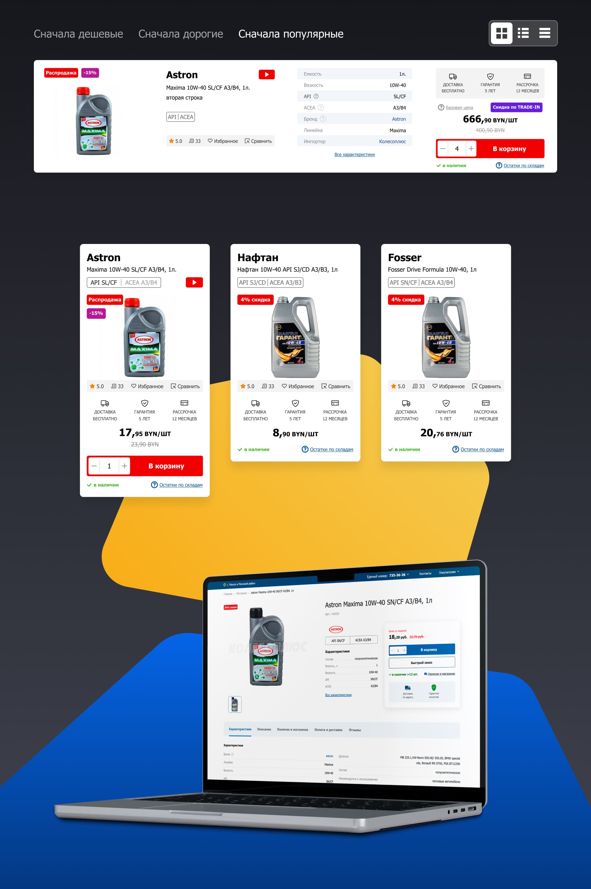 В ассортименте интернет-магазина «Колесо Плюс» представлены сотни шин и других авто-товаров с разнообразными характеристиками. Чтобы покупатели могли детально ознакомиться с предложением ещё на этапе выбора, мы разработали удобные режимы отображения каталога.