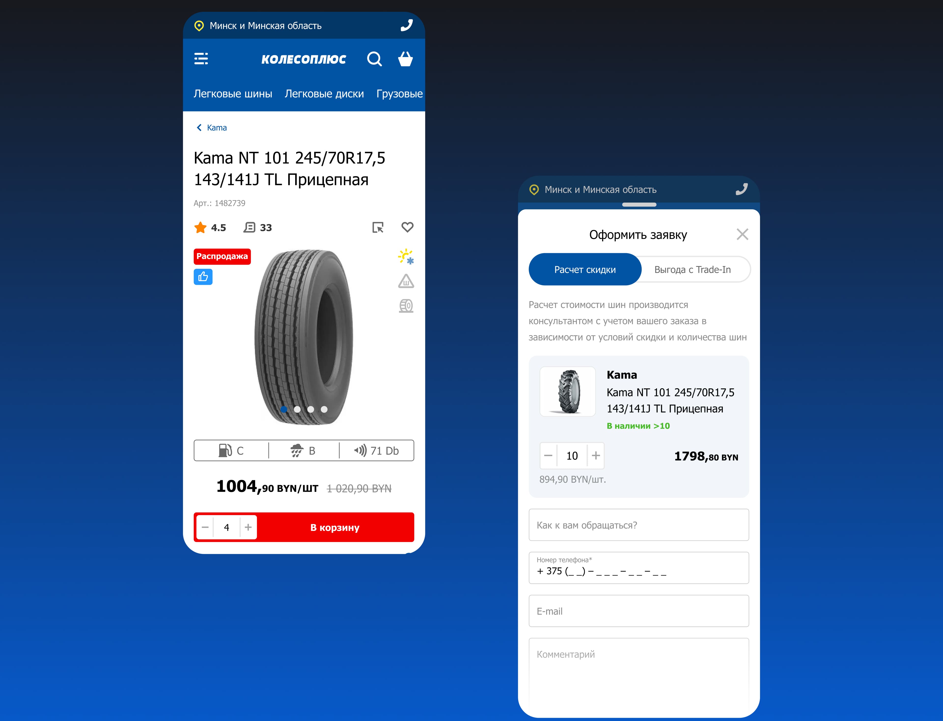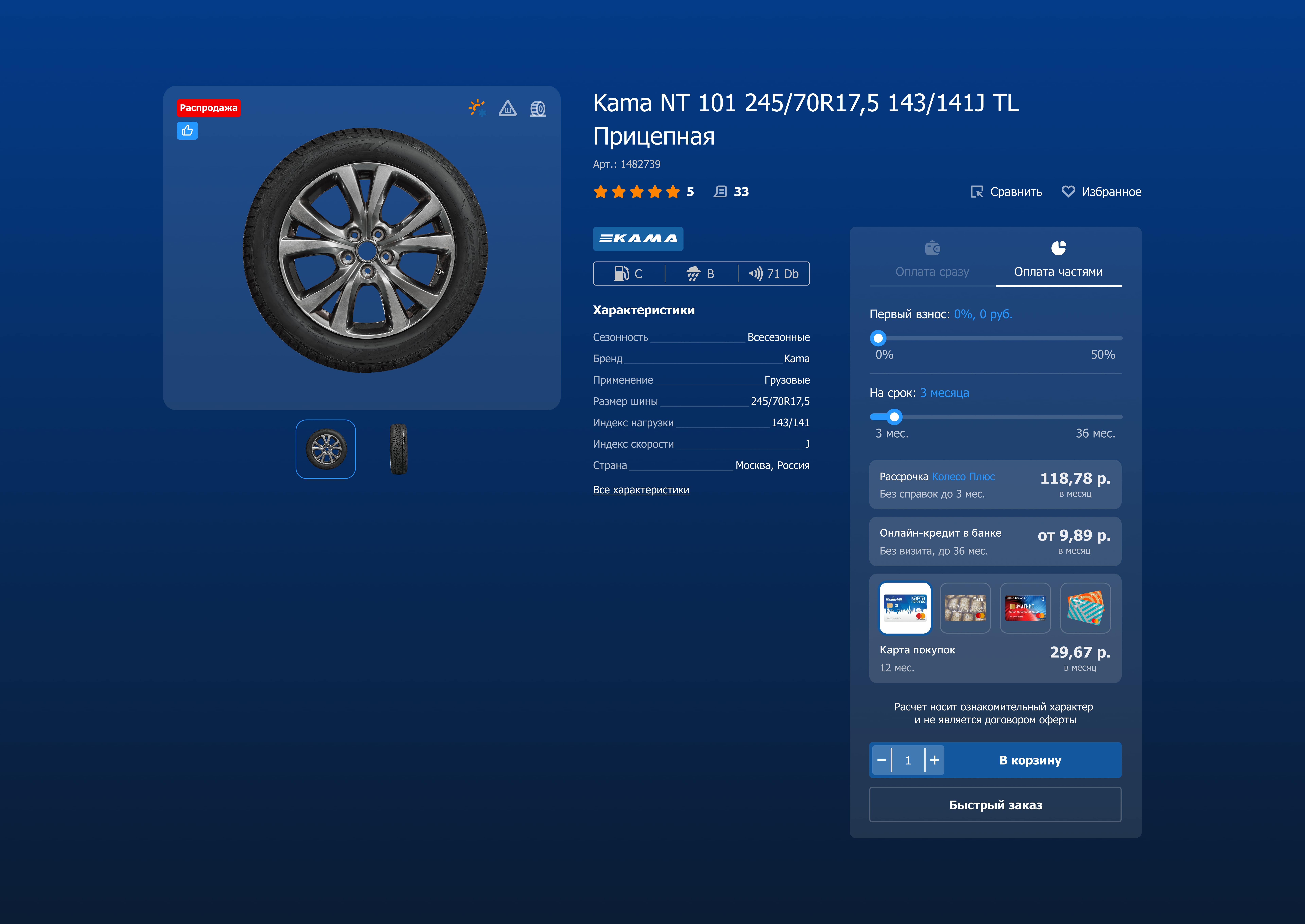 Для товаров с относительно высоким средним чеком, таких как шины и диски, возможность оплаты частями играет ключевую роль в принятии решения о покупке. Мы внедрили калькулятор, который наглядно демонстрирует ежемесячный платеж при оформлении кредита или рассрочки.